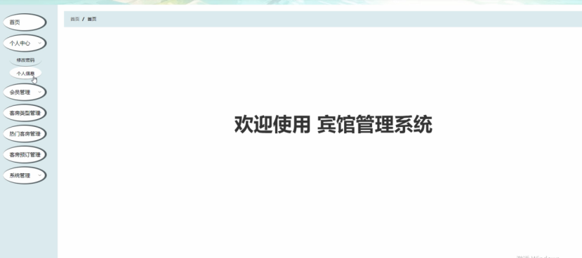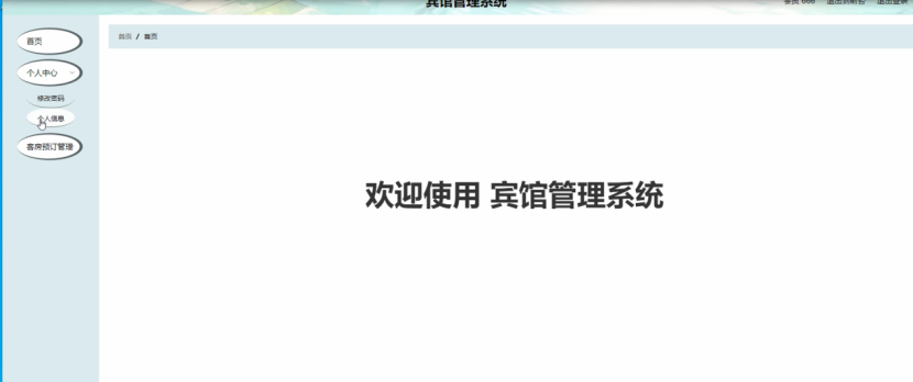 会员登录进入系统后台,可以对首页、个人中心、客房预订管理等功能模块进行相应操作,如图5-12所示。