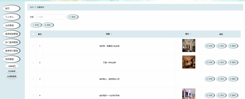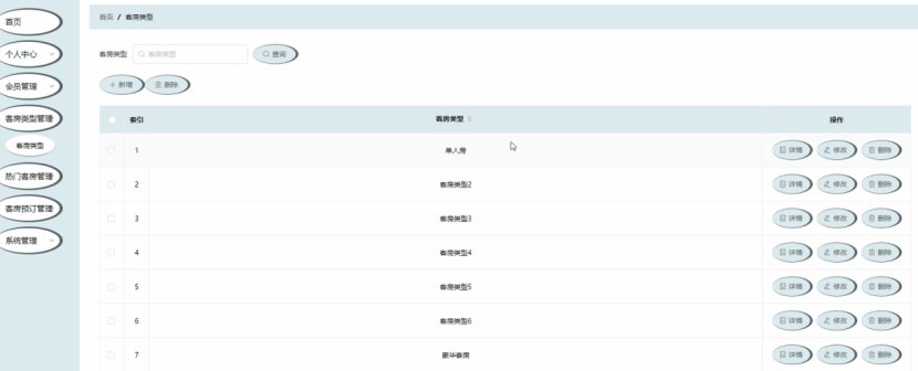 客房类型管理,在客房类型管理页面可以对索引、客房类型等内容进行详情、修改或删除等操作,如图5-8所示。