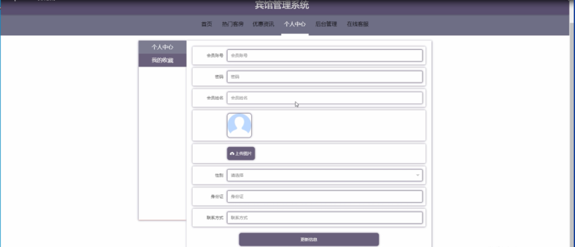 个人中心,在个人中心页面通过填写会员账号、密码、会员姓名、图片、性别、身份证、联系方式等内容进行更新信息等操作,并可以根据我的收藏进行相应的操作,如图5-4所示。