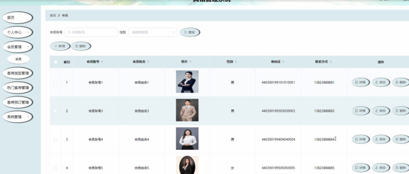 会员管理,在会员管理页面可以对索引、会员账号、会员姓名、照片、性别、身份证、联系方式等内容进行详情、修改或删除等操作,如图5-7所示。