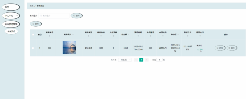 客房预订管理,在客房预订管理页面可以对索引、客房编号、客房图片、客房类型、客房价格、入住天数、总金额、预订时间、会员账号、会员姓名、身份证、联系方式、是否支付等内容进行详情或删除等操作,如图5-13所示。