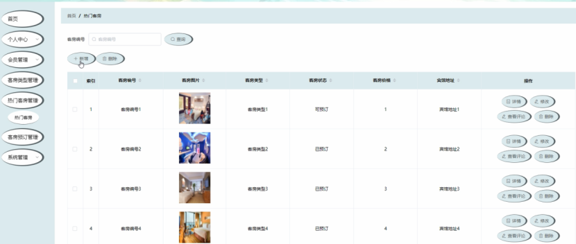 热门客房管理,在热门客房管理页面可以对索引、客房编号、客房图片、客房类型、客房状态、客房价格、宾馆地址等内容进行详情、修改、查看评论或删除等操作,如图5-9所示。