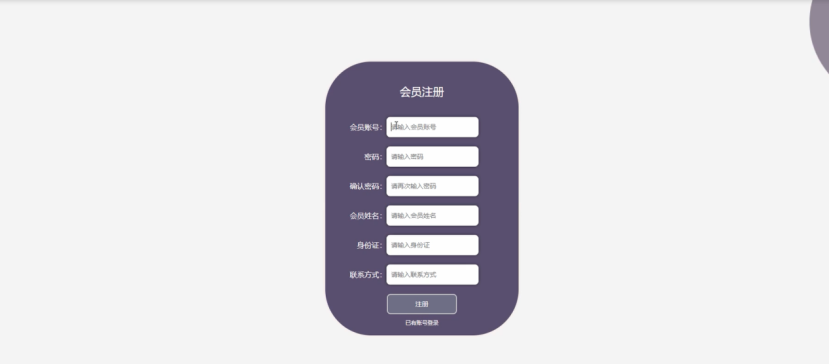 会员注册,在会员注册页面通过填写会员账号、密码、确认密码、会员姓名、身份证、联系方式等内容进行注册等操作,如图5-2所示。
