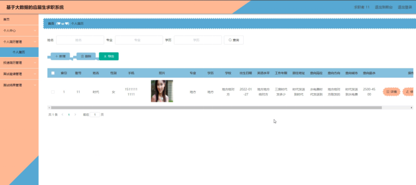 个人简历管理,在个人简历管理页面可以对索引、账号、姓名、性别、手机、照片、专业、学历、学校、出生日期、英语水平、工作年限、居住地址、意向岗位、意向方向、意向城市、意向薪水等内容进行详情,修改或删除等操作,如图4-15所示。