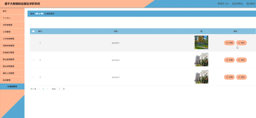 系统管理,在轮播图管理页面可以对索引、名称、值等内容进行详情或修改等操作,如图4-12所示。