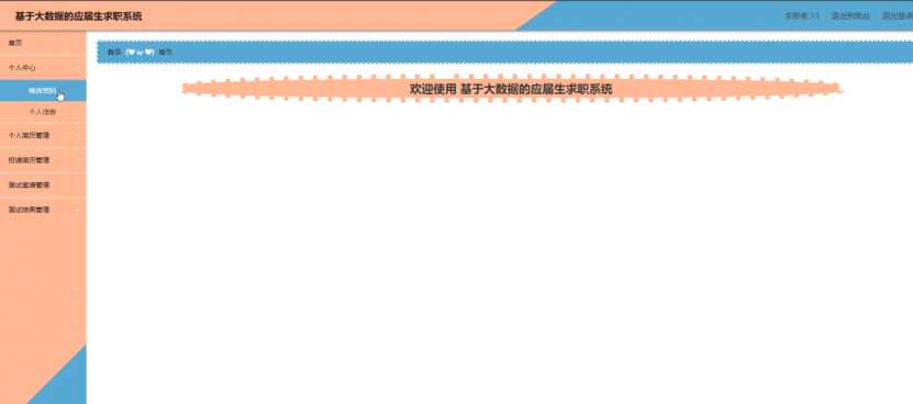 求职者登录进入基于大数据的应届生求职系统可以对首页、个人中心、个人简历管理、投递简历管理、面试邀请管理、面试结果管理等进行相应操作,如图4-13所示。