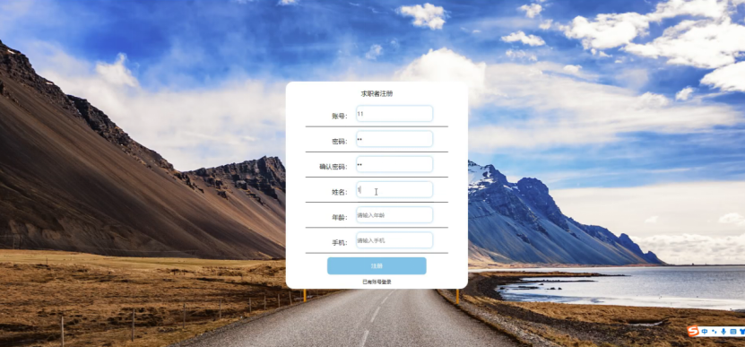 求职者注册,在求职者注册页面通过填写账号、密码、确认密码、姓名、年龄、手机等信息完成求职者注册,如图4-2所示。