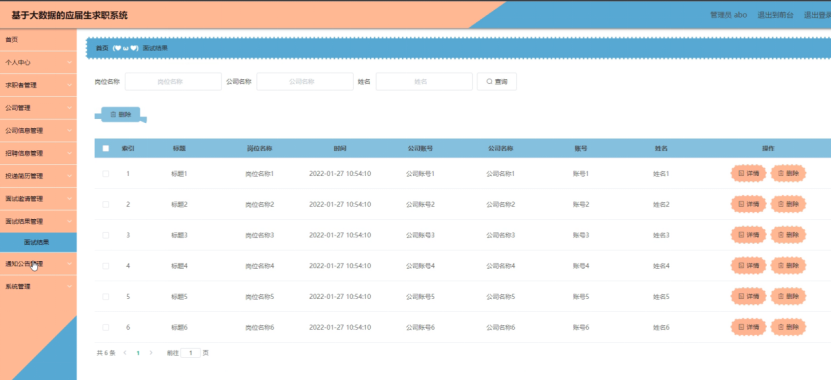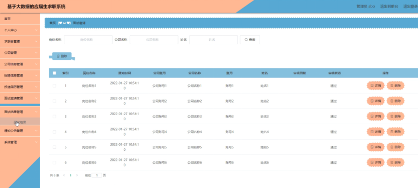 面试结果管理,在面试结果管理页面可以对索引、标题、岗位名称、时间、公司账号、公司名称、账号、姓名等内容进行详情或删除等操作,如图4-10所示。
