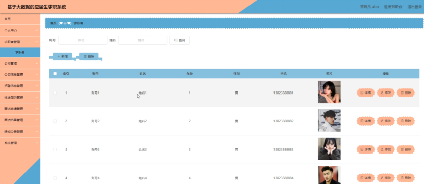 求职者管理,在求职者管理页面可以对索引、账号、姓名、年龄、性别、手机、照片等内容进行详情,修改或删除等操作,如图4-8所示。