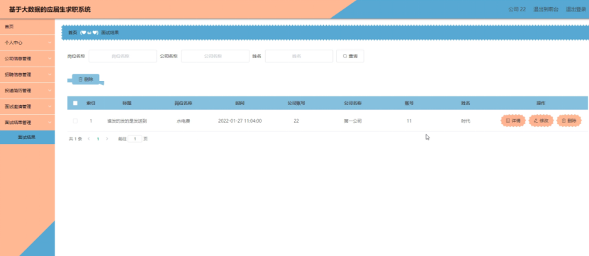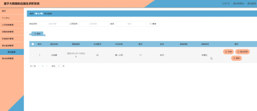 面试结果管理,在面试结果管理页面可以对索引、标题、岗位名称、时间、公司账号、公司名称、账号、姓名等内容进行详情,修改或删除等操作,如图4-21所示。
