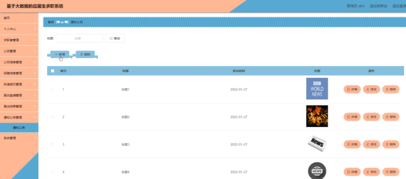 通知公告管理,在通知公告管理页面可以对索引、标题、发布时间、封面等内容进行详情,修改或删除等操作,如图4-11所示。