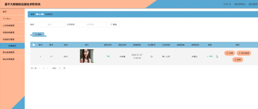 投递简历管理,在投递简历管理页面可以对索引、账号、姓名、照片、简历文件、岗位名称、投递时间、公司账号、公司名称、审核回复、审核状态、审核等内容进行详情,面试邀请,删除等操作,如图4-19所示。