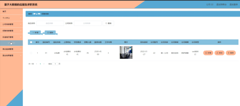 招聘信息管理,在招聘信息管理页面可以对索引、岗位编号、岗位名称、上班地址、学历要求、招聘人数、薪资待遇、工作年限、图片、发布时间、公司账号、公司名称、公司领域、公司规模、公司类型等内容进行详情,修改或删除等操作,如图4-18所示。