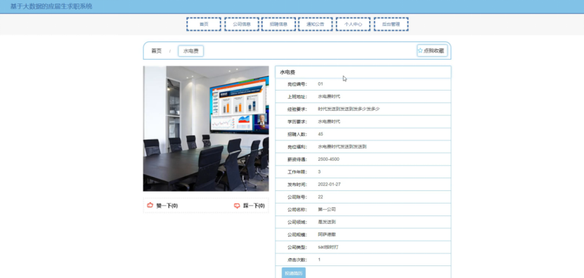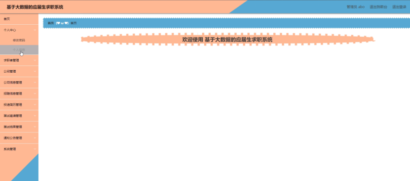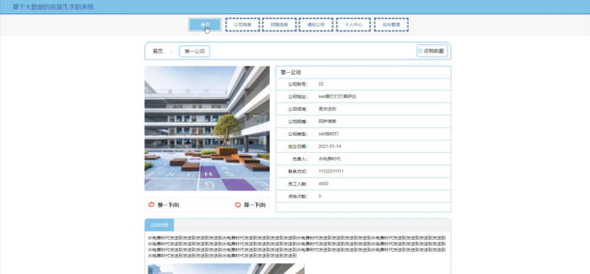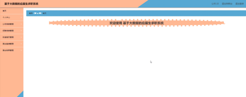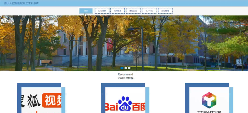 基于大数据的应届生求职系统,在系统首页可以查看首页、公司信息、招聘信息、通知公告、个人中心、后台管理等内容进行详细操作,如图4-1所示。