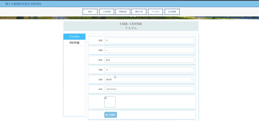 个人中心,在个人中心页面通过填写账号、密码、姓名、年龄、性别、手机、上传图片等信息进行更新信息,根据需要对我的收藏进行详细操作,如图4-5所示。