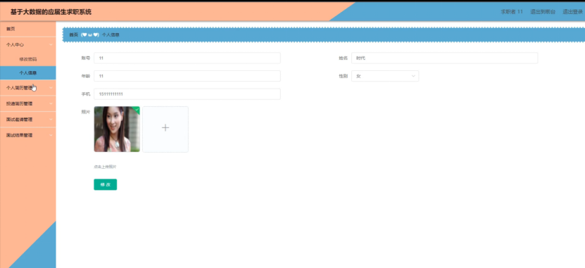 个人中心,在个人信息页面通过填写账号、姓名、年龄、性别、手机、照片等信息对个人信息进行修改操作,如图4-14所示。