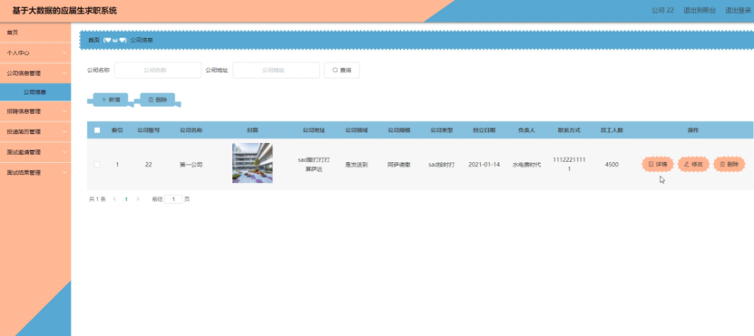 公司信息管理,在公司信息管理页面可以对索引、公司账号、公司名称、封面、公司地址、公司领域、公司规模、公司类型、创立日期、负责人、联系方式、员工人数等内容进行详情,修改或删除等操作,如图4-17所示。