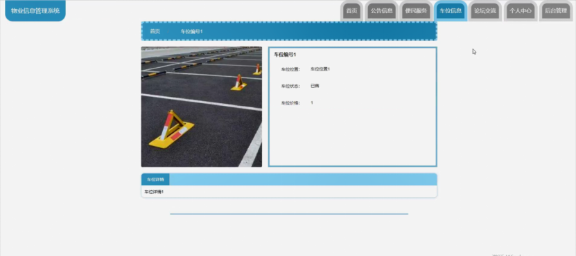 车位信息,在车位信息页面可以查看车位编号、车位位置、图片、车位状态、车位价格、车位详情等内容,如图5-4所示。