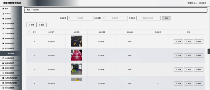 车位信息管理,在车位信息管理页面可以对索引、车位编号、车位图片、车位位置、车位状态、车位价格等内容进行详情,修改和删除等操作,如图5-11所示。