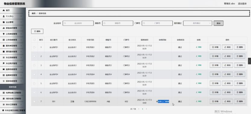 报修信息管理,在报修信息管理页面可以对索引、业主账号、业主姓名、手机号码、楼栋号、门牌号、报修时间、审核回复、审核状态、审核等内容进行详情,修改和删除操作,如图5-13所示。