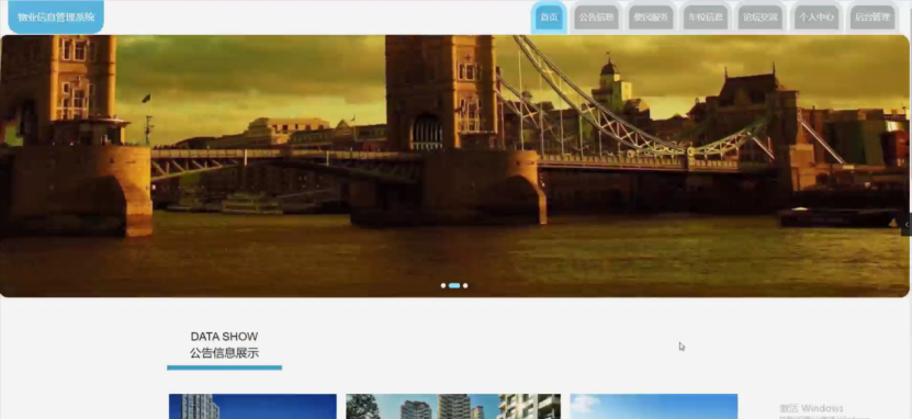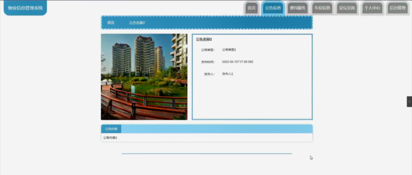 物业信息管理系统,在系统首页可以查看首页、公告信息、便民服务、车位信息、论坛交流、个人中心、后台管理等内容,并进行详细操作;如图5-1所示。