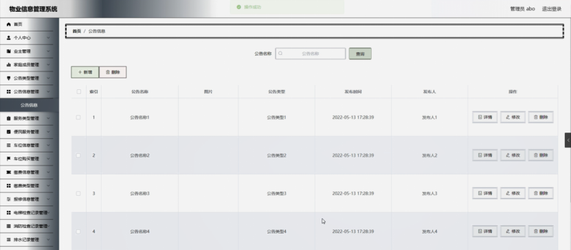 公告信息管理,在公告信息管理页面可以对索引、公告名称、图片、公告类型、发布时间、发布人等内容进行详情,修改和删除等操作,如图5-10所示。