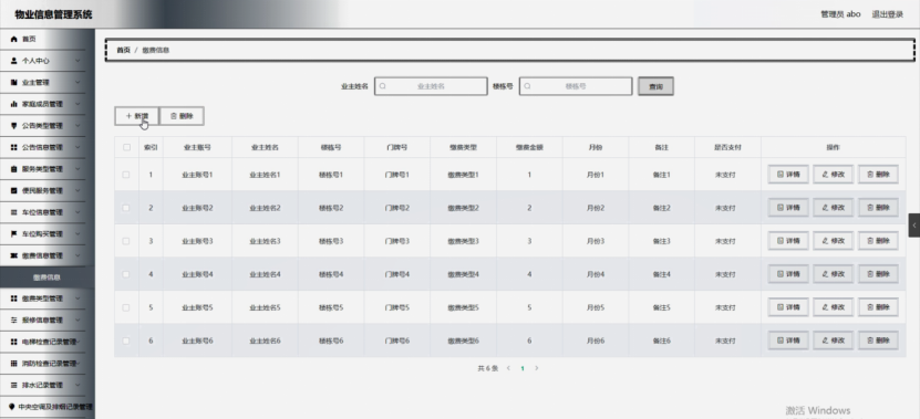 缴费信息管理,在缴费信息管理页面可以对索引、业主账号、业主姓名、楼栋号、门牌号、缴费类型、缴费金额、月份、备注、是否支付等内容进行详情,修改和删除等操作,如图5-12所示。