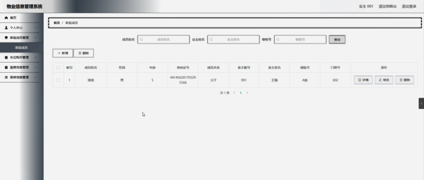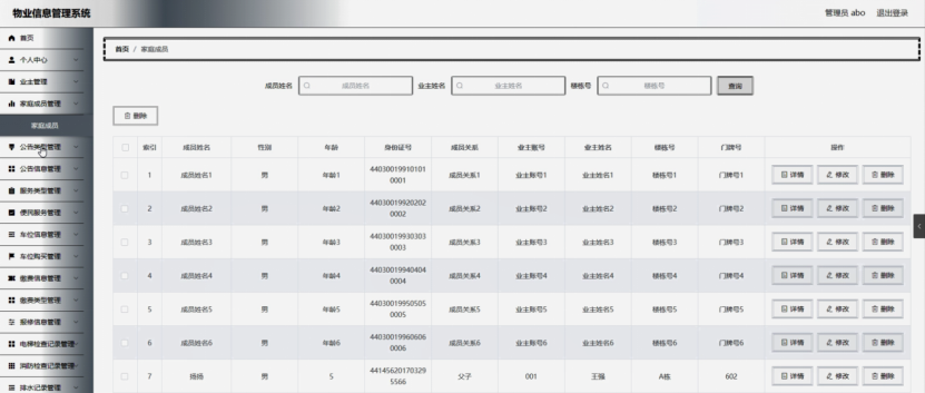 家庭成员管理,在家庭成员管理页面可以对索引、成员姓名、性别、年龄、身份证号、成员关系、业主账号、业主姓名、楼栋号、门牌号等内容进行详情,修改和删除等操作,如图5-9所示。