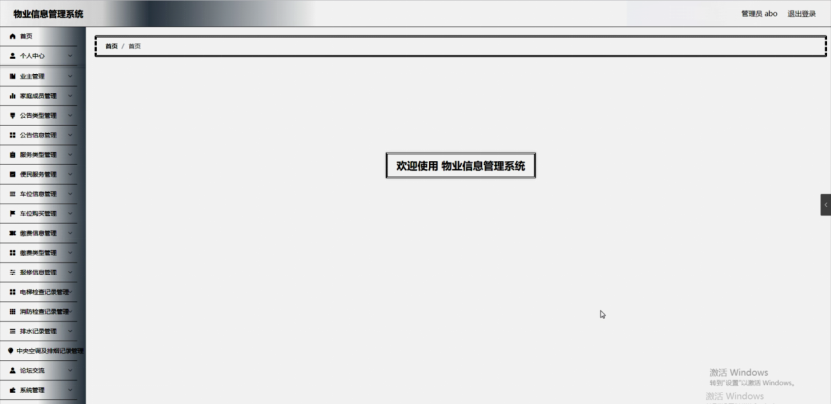 管理员登陆系统后,可以查看首页、个人中心、业主管理、家庭成员管理、公告类型管理、公告信息管理、服务类型管理、便民服务管理、车位信息管理、车位购买管理、缴费信息管理、缴费类型管理、报修信息管理、电梯检查记录管理、消防检查记录管理、排水记录管理、中央空调及排烟记录管理、论坛管理、系统管理等功能,还能对每个功能逐一进行相应操作,如图5-7所示。