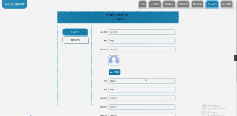 个人中心,在个人中心页面通过填写业主账号、密码、业主姓名、上传图片、性别、年龄、手机号码、出生年月、身份证号、门牌号等内容进行更新信息操作,并根据需要对我的发布进行详细操作;如图5-5所示。