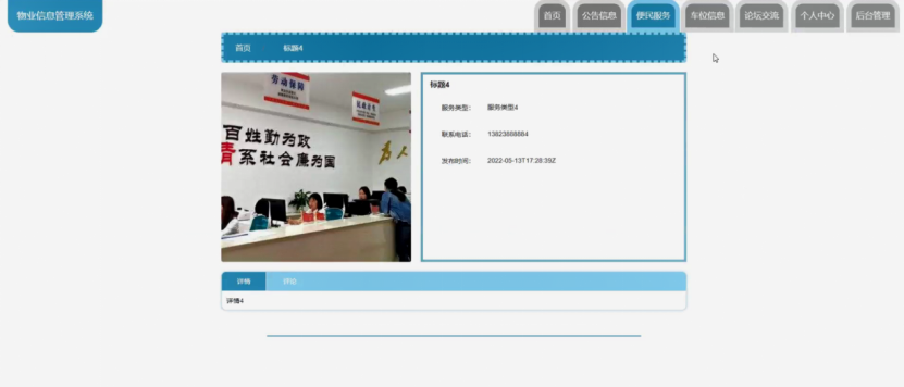 便民服务,在便民服务页面可以查看标题、服务类型、图片、联系电话、发布时间、详情等内容,并进行评论操作,如图5-3所示。