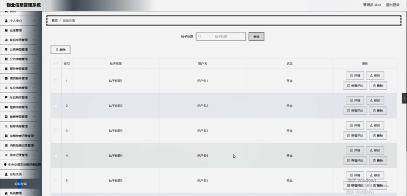 论坛管理,在论坛管理页面可以对索引、帖子标题、用户名、状态等内容进行详情,修改,查看评论或删除操作,如图5-14所示。