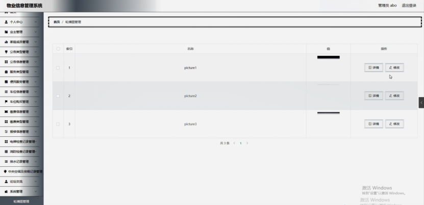 系统管理,在轮播图管理页面可以对索引、名称、值等内容进行详情或修改操作;如图5-15所示。