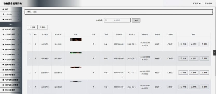 业主管理,在业主管理页面可以对索引、业主账号、业主姓名、头像、性别、年龄、手机号码、出生年月、身份证号、楼栋号、门牌号等内容进行详情,修改和删除操作,如图5-8所示。