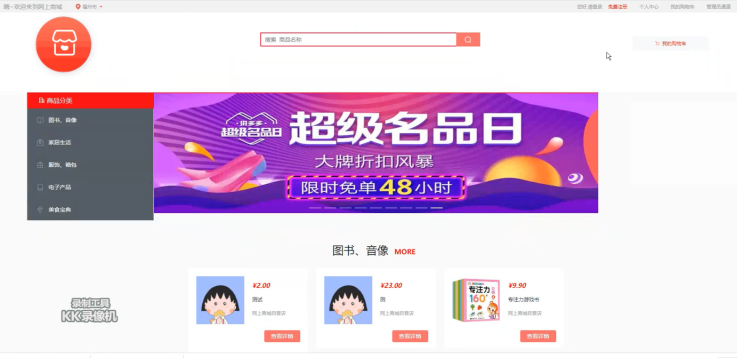 网上购物商城的首页信息以商品展示以及商品分类内容为主,同时用户可以通过搜索栏实现商品信息的搜索,通过首页的商品展示窗口也可以实现商品信息查看,右上方的导航栏内包含了用户注册窗口、个人中心、购物车以及管理员登录窗口,系统首页界面内容如下图所示: