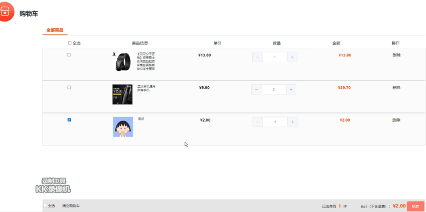 用户完成商品加购后可以通过系统首页的购物车进入到购物车管理界面,该界面主要呈现了用户架构的所有商品信息,同时还包括了商品单价及加购数量信息,可以通过数据及商品信息的筛选来实现在线的结算,系统会自动计算商品不含运费的金额合计,同时可以通过左下角的清空购物车实现购物车的一键清空,具体购物车管理界面内容如下图: