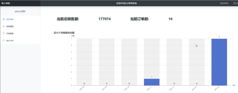 通过后台的统计分析可以获取到商城当前的总销量额及订单数,同时通过柱状图直观的表现近7个月的销量达成情况,具体销售数据统计内容界面呈现如下图: