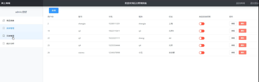 系统管理员后台的主要功能内容包括了商品信息管理、卖家管理、买家管理以及销售数据统计分析等内容,管理员用户可以通过系统后台实现买卖双方的信息管理及新增,具体管理员后台管理界面信息呈现内容如下: