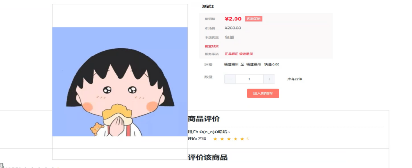 用户通过首页的商品信息搜索可以进入到商品详情界面,商品信息包括了商品图片、商品的促销价格及市场价等信息,同时还包括了运费信息以及商品评价等内容,用户可以根据界面提供的库存信息选择相应的购买数量,通过加入购物车完成商品信息的架构,具体商品信息界面内容如下:
