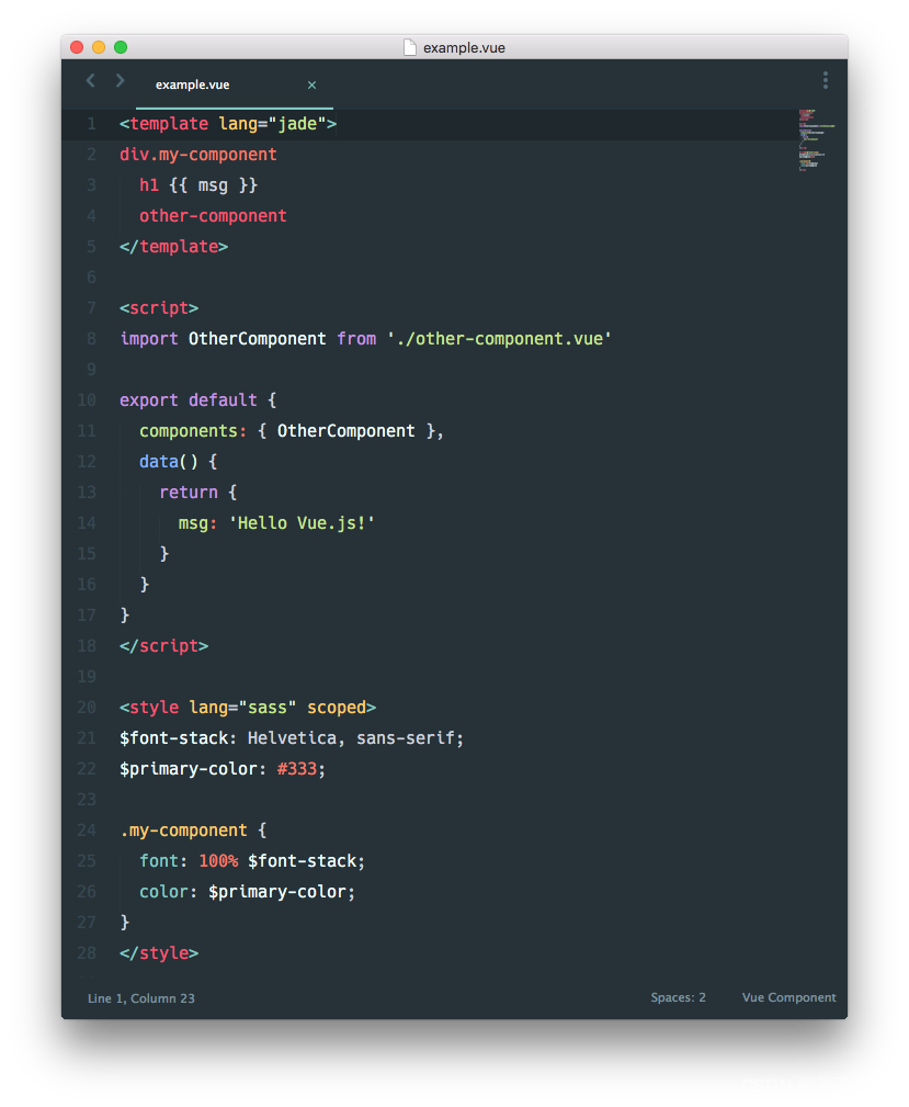 <style>使用 Sass 和对<template>使用 Jade; .vue文件中允许自定义节点,然后使用自定义的 loader 进行处理;- 把