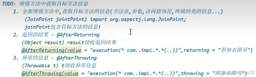 * 前置:@Before * 后置:@AfterReturning * 异常:@AfterThrowing * 最后:@After * 环绕:@Around