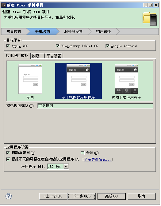 在 Flash Builder 4.6 中新建移动项目,选择“基于视图的应用程序”,如图: