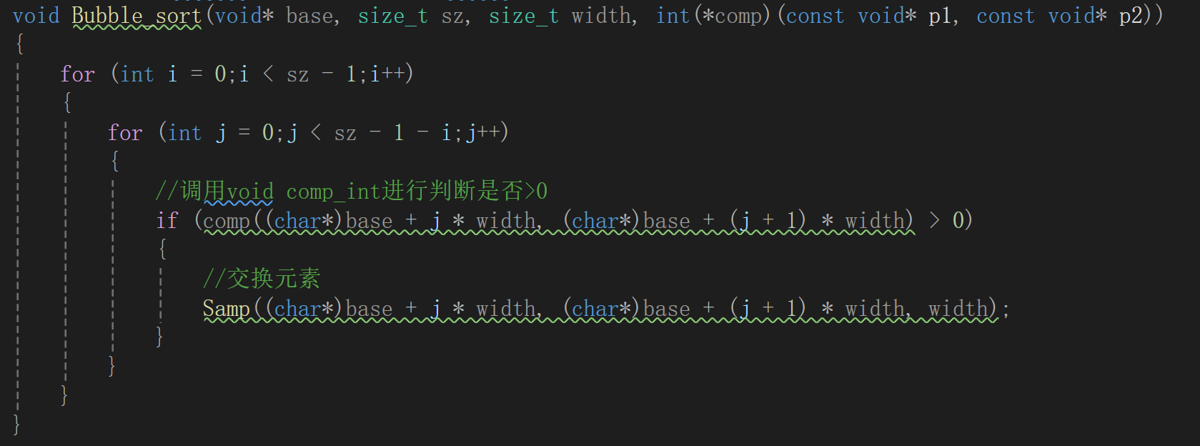 comp函数:传入第 j 个和第 j+1 个元素的地址,由comp决定 “谁大谁小”—— 如果返回值 > 0,说明需要交换这两个元素。
