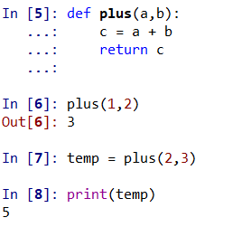 上述自定义函数 plus 实现的是加法功能,其中 a 和 b 是传入的参数,c是返回的值。