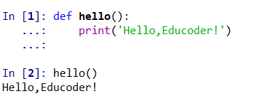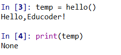 上述自定义函数 hello 实现的是,打印“Hello,Educoder!”的功能,没有参数,也没有使用 return,返回的值是 None。可以看到,print前面有缩进。