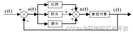 PID 控制器是一种线性控制器,它根据给定值与实际输出值构成控制偏差。将偏差的比例§、积分(I)和微分(D)通过线性组合构成控制量,对被控对象进行控制,故称 PID 控制器,原理框图如图所示。