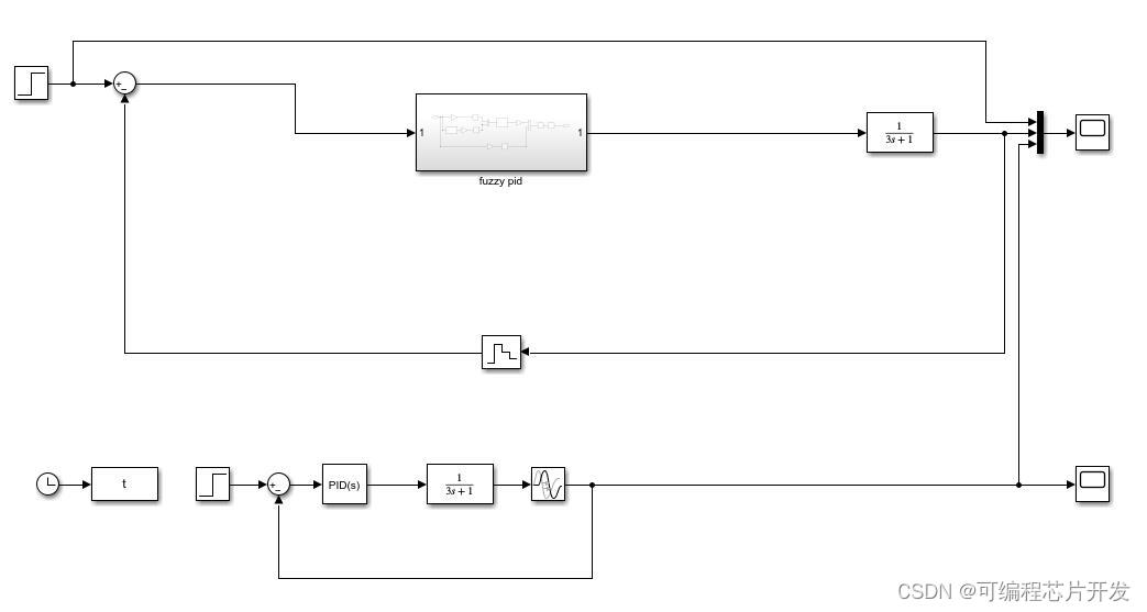 在simulink,分别建模实现一个模糊PID控制器和一个PID控制器,然后将PID控制器的控制输出和模糊PID的控制输出进行对比。