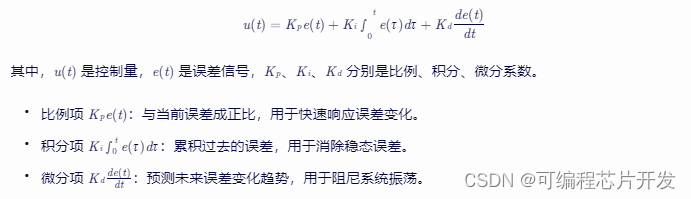 PID控制器,即比例-积分-微分控制器,是一种广泛应用于工业控制领域的闭环反馈控制器。其核心思想是通过比较期望输出与实际输出之间的差异(即误差),并根据误差的比例、积分和微分三项来计算控制量,从而调整系统的行为以达到期望的输出。