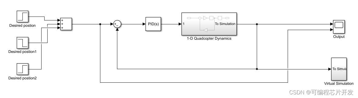 基于PID控制器的四旋翼无人机控制系统的simulink建模与仿真,并输出vr虚拟现实动画,输出PID控制器的控制反馈曲线。整个仿真过程,无人机为升空,下降,再升空的飞行效果。