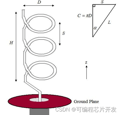 螺旋天线是一种常见的圆极化天线,适用于卫星通信系统,因其具有轴比低、带宽较宽和结构紧凑的特点而备受青睐。典型的螺旋天线由一个或多圈等间距的金属螺旋线构成,其辐射特性主要取决于螺旋线的几何参数,如螺距、直径、线宽以及螺旋圈数等。